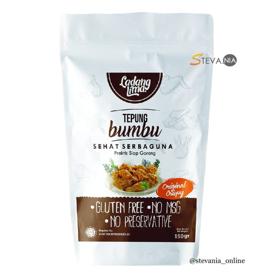 Tepung Singkong Ladang Lima, tepung beras, tepung maizena, garam, kaldu ayam, rempah-rempah alami dan baking soda.