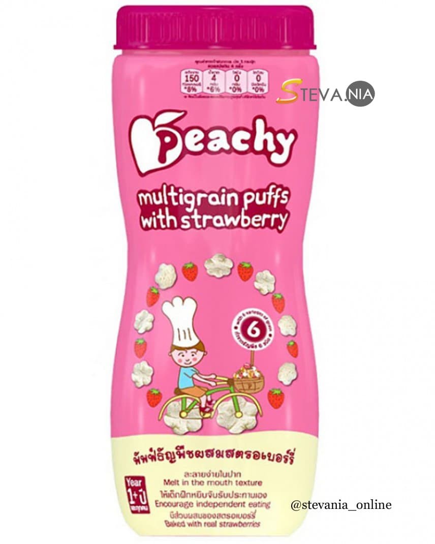 Our puffs are baked with specially selected multigrains and strawberry for a nutritious, tasty snack. The light texture and small size makes them a good choice for toddlers to develop hand-eye coordination and independent eating habits. Peachy puffs can be served straight from the pot or mixed with milk.